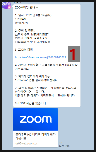 ▶ 줌 기간은 50분 ~ 1시간 정도 진행됩니다. 이때 줌은 50분 이상 참여하셔야, USDT가 지급이 됩니다.