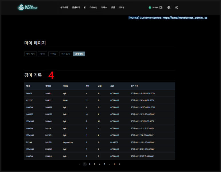 ⑷ 경마기록에 보시면 계속 나의 nft경주마들이 경기를 했던 전적들이 나옵니다..