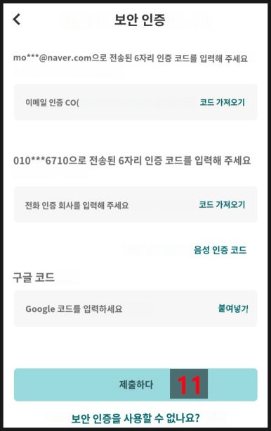 이메일 인증, 전화 인증, 추가한 거래소 OTP 6자리 숫자를 넣어 "제출하기"를 클릭합니다.